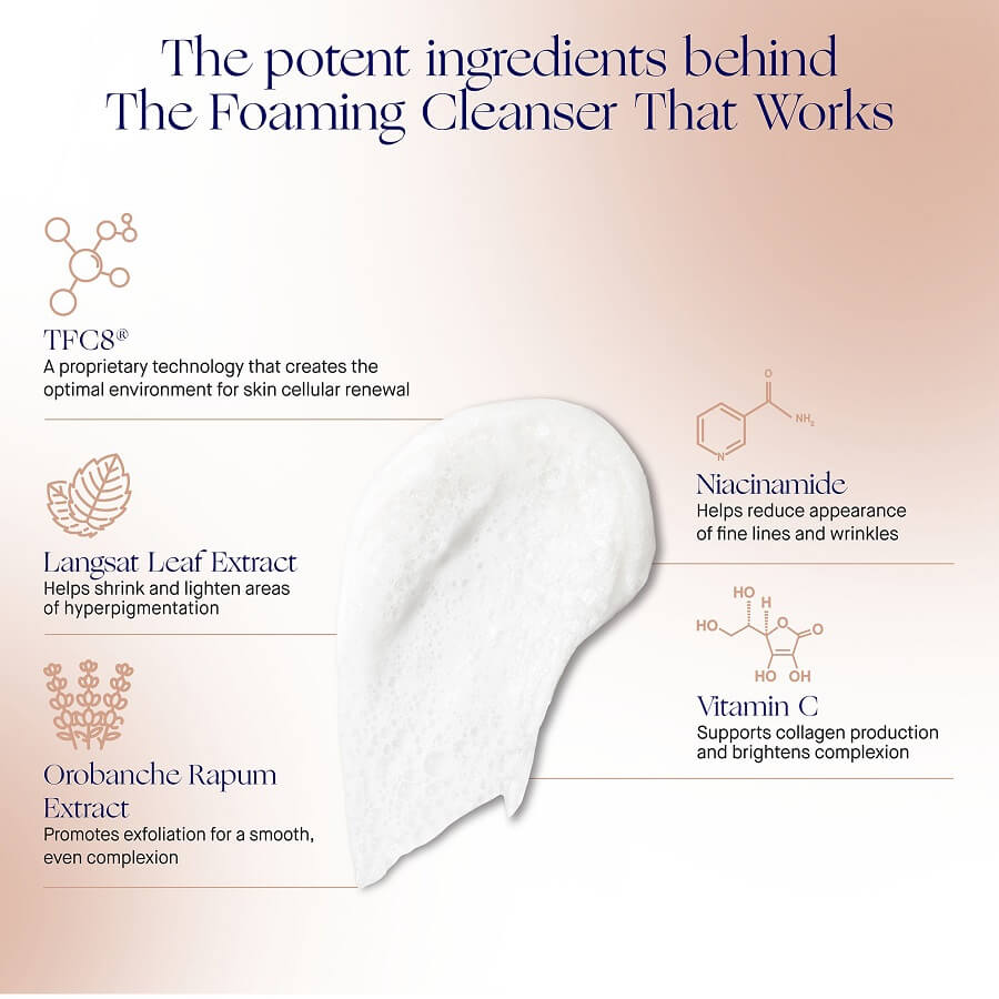 Čistilno dnevno sredstvo, ki nežno odstrani nečistoče, ličila in odvečno maščobo, medtem ko vrača vlažnost, umirja kožo in posvetli vaš ten. Temelji na TFC8® tehnologiji in je formuliran s čistimi super-hidratanti ter močnimi rastlinskimi sestavinami, vključno z izvlečkom večernega lista langsata in obnavljajočim izvlečkom Orobanche Rapum. Izvleček lista langsata, bogat s hranili, pomaga zmanjšati hiperpigmentacijo, ki jo povzročajo okoljskih stresorji, za sijočo in enakomerno kožo. Izvleček Orobanche Rapum pospešuje naravni cikel obnove kože, spodbuja piling, uravnoveša mikrofloro kože in krepi kožno pregrado. Niacinamid pomaga umiriti kožo, zmanjšati rdečico, pore, fine linije in gube ter poveča sijaj. Moringa olje je bogato z oleinsko kislino, znano po intenzivno vlažilnih, antimikrobnih in protivnetnih lastnostih ter se bori proti znakom staranja. Izvleček drevesa Quillaja Saponaria, bogat s saponini, odstrani odvečno maščobo in preprečuje izgubo vode, kar pušča kožo čisto, mehko in obnovljeno.