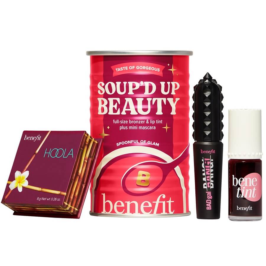 Božični lepotilni komplet Soup’d Up Beauty by Benefit sestavljajo bronzer, maskara in barva za lička ter ustnice. Zdaj je čas, da s temi tremi prodajnimi uspešnicami skuhate najljubšo juho. Nanesite bronzer Hoola, ki vam omogoča naraven sijaj, za rožnata lička in ustnice bo poskrbel Benetint (viralna senzacija), nato pa dodajte še malce 36-urnega* polnega volumna z maskaro BADgal BANG! – rezultat bo čudovit videz celotnega obraza, zaradi katerega se boste počutili slastno kot glavna jed.