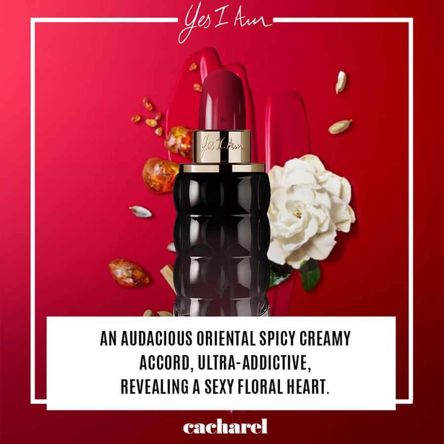 Parfumska voda Yes I Am je dišava, značilna za drzne in močne ženske, tako čutne kot neodvisne. Parfumska voda Yes I Am je kot prava izjava ženstvenosti namenjena ženskam, ki pišejo svojo zgodbo. Kultna steklenička v obliki šminke, simbola ženstvenosti, bo postala vaš nepogrešljiv predmet. Nežno vgravirana, rdeča, sijoča kroglica s Cacharel C in črnim steklom - je popolnoma čudna in glamurozna. Vzemite jo s seboj kamor koli greste in se kot afrodiziaku prepustite njenemu zasvoljivemu značaju. Prva aroma "Spicy Cremoso" blagovne znamke Cacharel Parfums je drznih in ostrih kremastih not, izjemno privlačna in obsežna ter razkriva seksi cvetlično notranjost, začinjeno s pikantnimi notami. Čutna in moderna orientalsko-začinjena aroma v obliki kultnega predmeta, značilnega za ženske - rdeče vrtnice.