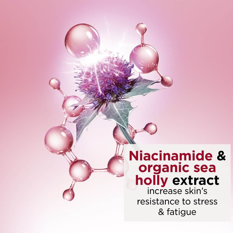 - [Skin Charger Complex]: Niacinamid v kombinaciji z izvlečkom morskega lista tvori močan duet, ki pomaga zmanjšati prve vidne znake staranja. Okrepi zaščitno funkcijo kože, poveča njen sijaj in ohranja njen mladosten videz.