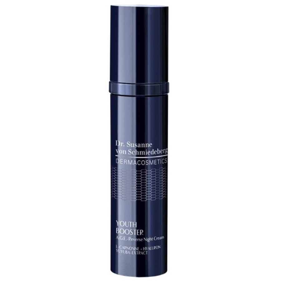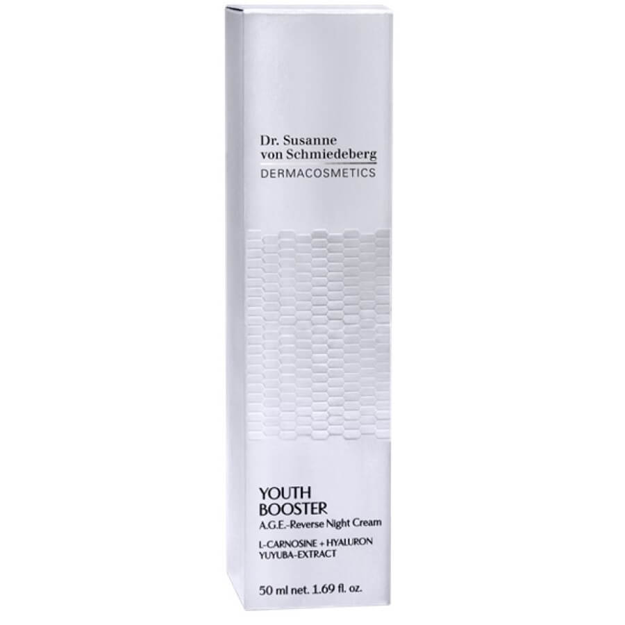 Nočna krema Youth Booster A.G.E. Reverse od Dr. Susanne von Schmiedeberg ima dvojni in učinkovit učinek proti staranju kože: upočasnjuje saharifikacijo celic in že otrdelim kolagenskim vlaknom zagotavlja večjo elastičnost. Edinstvena aktivna sestavina L-Karnosin lahko zmanjša A.G.E.s (Advanced Glycation Endproducts), ki so odgovorni za saharifikacijo kože, ter tako upočasni proces staranja kože. Hkrati lahko inovativni ekstrakt Yuyube povrne elastičnost že saharificiranim kolagenskim vlaknom z podporo razgradnje obstoječih A.G.E.s.