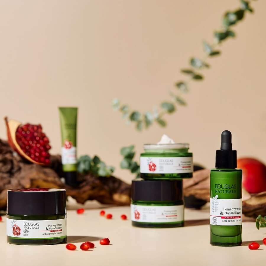 Serum proti staranju Douglas Naturals navdušuje s svojo izjemno močjo proti staranju: obogaten z izvlečkom granatnega jabolka in fitokolagenom, alternativo živalskemu kolagenu, ta izredno lahek izdelek vlaži in poskrbi za polnejšo kožo. Prav tako zmanjša linije in gube ter poskrbi za gladko, mladostno in svežo kožo. Hitro se vpije in ne pušča sledi. Serum je posebej prilagojen potrebam zrele kože in ima Ecocert certifikat COSMOS ORGANIC.