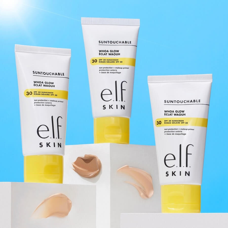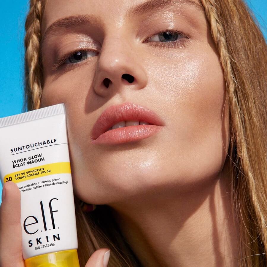 Nanesite, zaščitite in zasijte! e.l.f. Cosmetics Suntouchable! Whoa Glow SPF 30 je lahek hibrid kreme za sončenje/primerja za obraz, ki zagotavlja zaščito pred soncem širokega spektra, pripravi vašo kožo na dolgo obstojnost ličil in zagotavlja sijoč, neviden zaključek. Pomirjujoča in vlažilna formula za zaščito pred soncem na koži ni mastna, vsebuje pa tudi alojo, hialuronsko kislino in skvalan. Uporabite ga kot zadnji korak v svoji rutini nege kože za naraven sijaj ali kot primer za ličila.