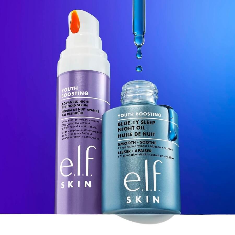 <p>e.l.f. SKIN Youth Boosting Blue-ty Sleep Night Oil je nežno, a učinkovito olje za obraz z 1 % granativnega retinoida, ki sčasoma zmanjša videz drobnih gub, neenakosti, suhosti in pustosti kože. Vsebuje izvleček borovnice in olje borage. Hranljiva, hitro vpojna formula deluje med spanjem. To olje za obraz ni komedogeno, varno za občutljivo kožo in ima modro barvo, ki zbledi, ko se nanese na kožo.</p>