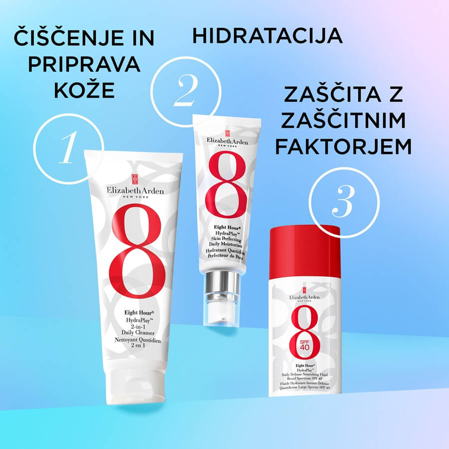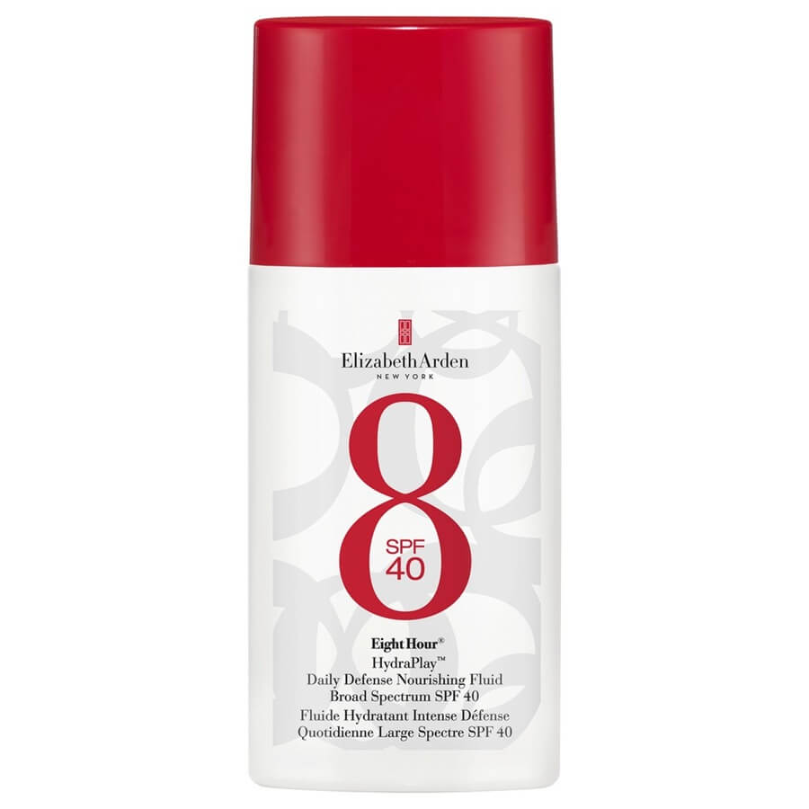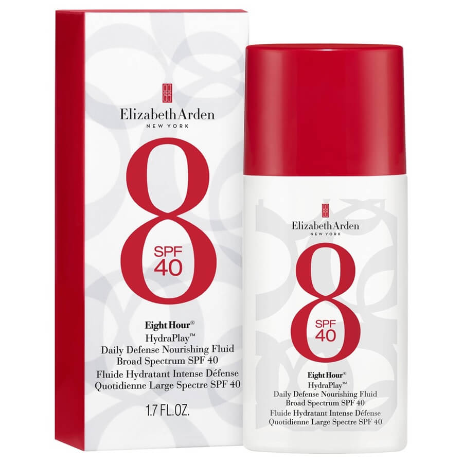 Eight Hour® HydraPlay™ Daily Defense Nourishing Fluid Broad Spectrum SPF 40 ščiti kožo pred onesnaženjem, modro svetlobo in UVA/UVB žarki, ne da bi na koži puščal beli film. Formula je izjemno lahka in jo je mogoče uporabljati tudi čez ličila. Po uporabi je koža sijoča in zaščitena. Ne vsebuje dišav in ne zamaši por.