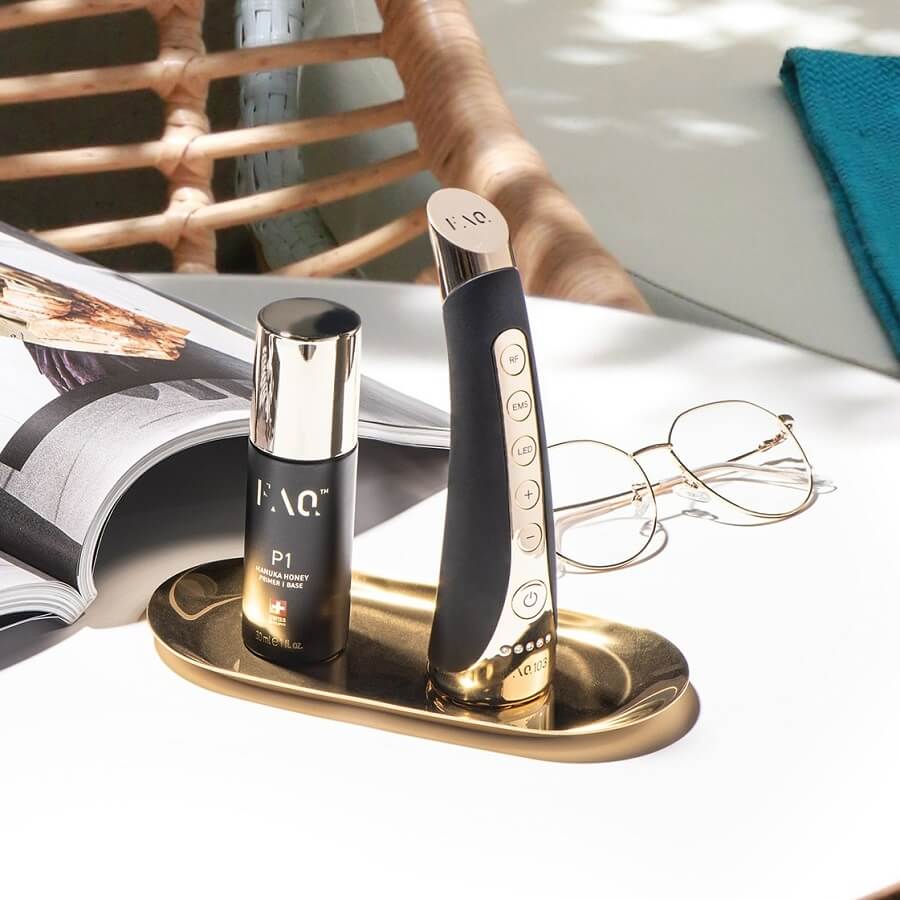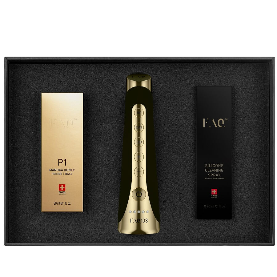 Električna stimulacija mišic (EMS) uporablja nizkonapetostne tokove v kombinaciji s FAQ™ P1 Manuka Honey Primerjem za varno uporabo in učinkovite rezultate neinvazivnega oblikovanja in učvrščevanja povešene kože, medtem ko vas Anti-Shock SystemTM ščiti pred spremembami napetosti. Power-RF nežno stimulira kožo za pospeševanje proizvodnje kolagena in zmanjševanje videza gub, medtem ko LED terapija polnega spektra hitro zmanjšuje nepravilnosti in izboljšuje naravne sposobnosti zdravljenja, pri čemer vsaka LED luč zadovoljuje specifične potrebe kože. Dobrodošli v novo ero resnično učinkovitega zdravila proti staranju. FAQ™ 103 - vaš dnevni odmerek razkošja!