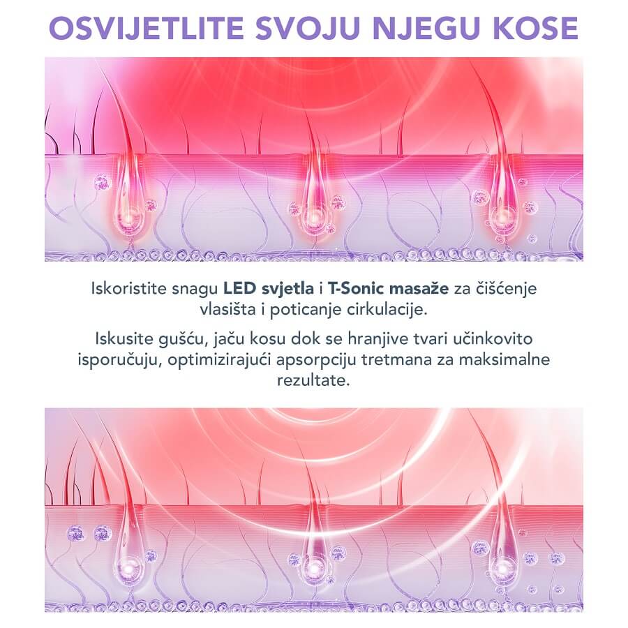 T-Sonic™ masaža z do 6500 pulzacijami na minuto nežno stimulira lasišče, izboljša mikrocirkulacijo, kar omogoča lažji dostop kisika in bistvenih hranilnih snovi do lasnih mešičkov.