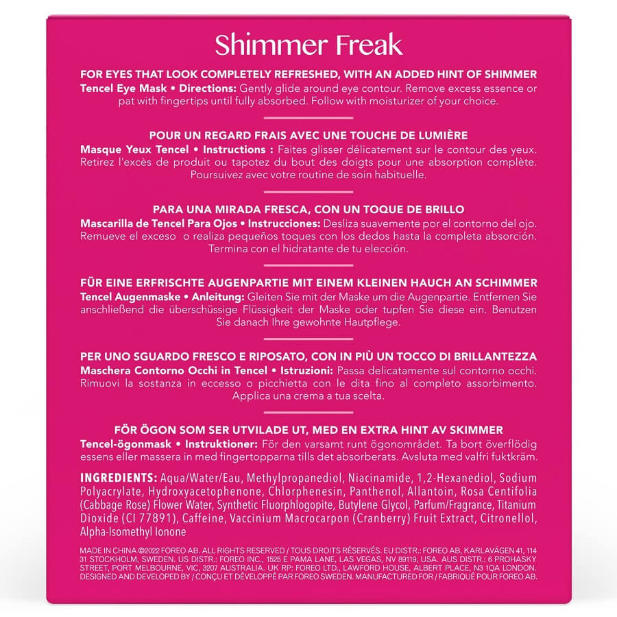 Utrujene oči? Izginjeno v hipu s Shimmer freak 2.0, briljantno masko za lepoto oči s kofeinom. Zasnovan posebej za osvežitev občutljive konture okoli oči za revitaliziran, osvežen videz, je idealen za utrujene oči s temnimi kolobarji in zabuhlostjo. Maska združuje modro in rdečo LED terapijo, hlajenje in T-Sonic™ pulzacije s 93 % naravnimi sestavinami za povečanje sijaja v predelu pod očmi, ne da bi mašila pore. Antioksidativne lastnosti kofeina, izvlečka brusnice in rožne vode krepijo kožno tkivo in se borijo proti zabuhlosti, medtem ko niacinamid prinaša novo življenje starajoči se koži s svojimi lastnostmi proti staranju.