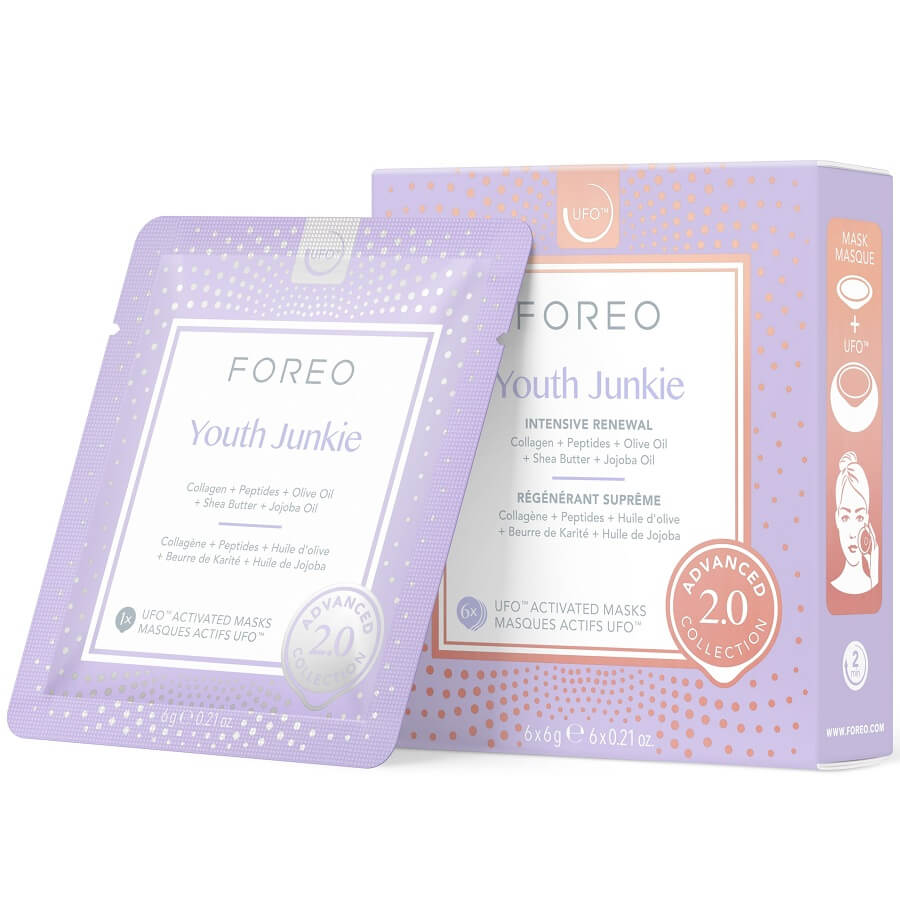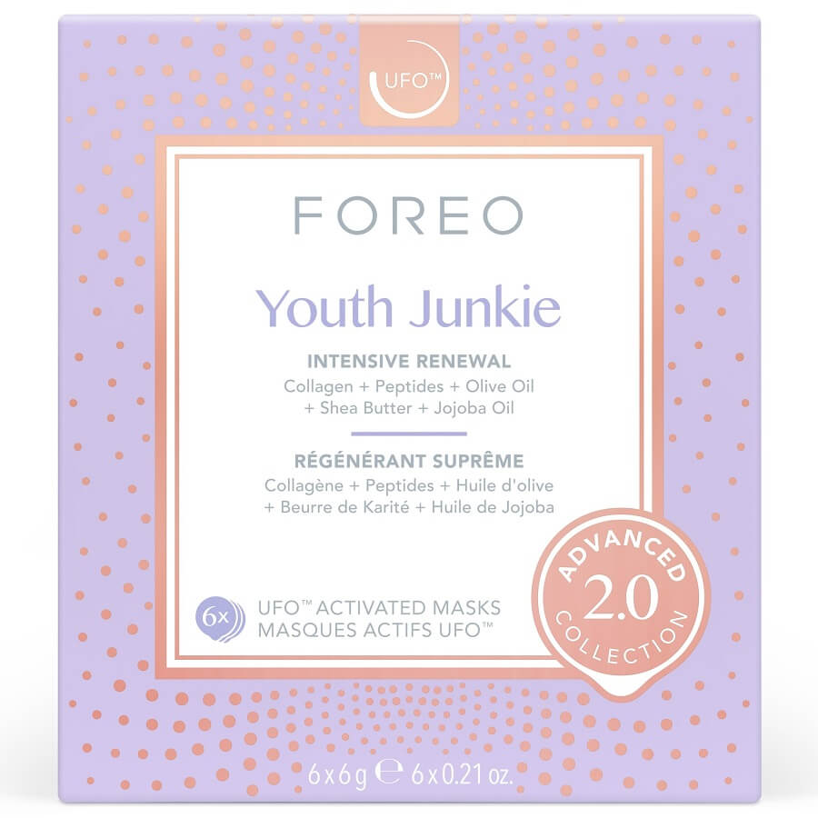 Youth Junkie 2.0 je bogata lepotilna maska za obraz za suho, zrelo kožo – čudežni zaščitni eliksir proti staranju, namenjen intenzivni obnovi starajoče se kože. Kombinacija rdeče LED terapije, ogrevanja in globokih utripov T-Sonic™ z 89 % naravnih sestavin, ki vračajo mladost, je idealna za tiste, ki želijo suhi, nagubani koži povrniti izgubljeno svežino in prožnost. Povečajte proizvodnjo kolagena v samo 2 minutah za vidno bolj gladko polt mlajšega videza in uživajte v gladki, mlečni formuli, prepojeni s popolnoma biorazgradljivimi morskimi algami in materialom Tencel za klinično dokazan 8-urni učinek globoke hidracije. Formula je na voljo v pakiranju po 6 vrečk, združljivih z vsemi napravami UFO™.