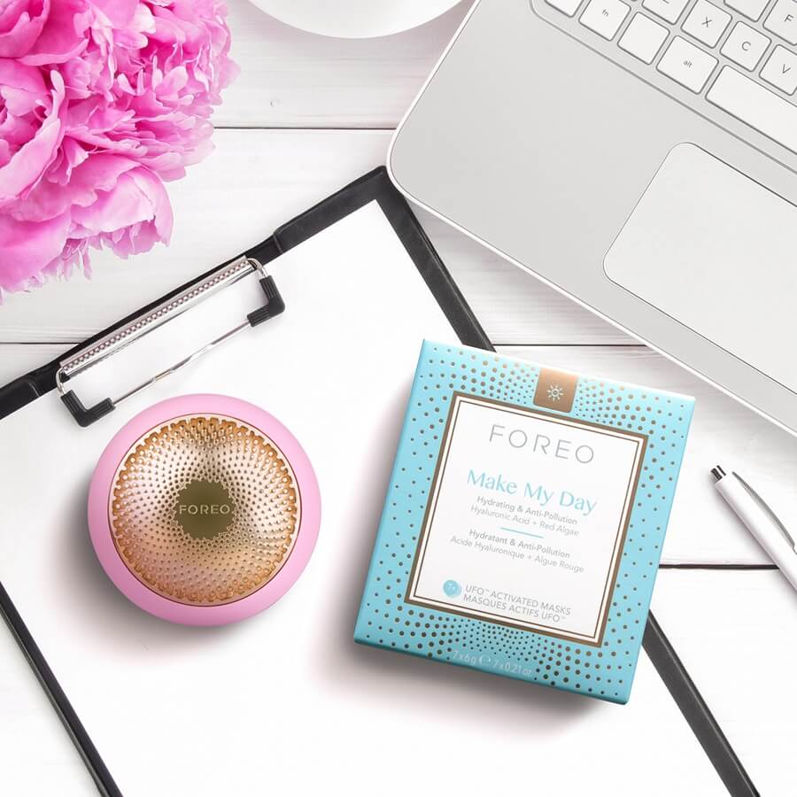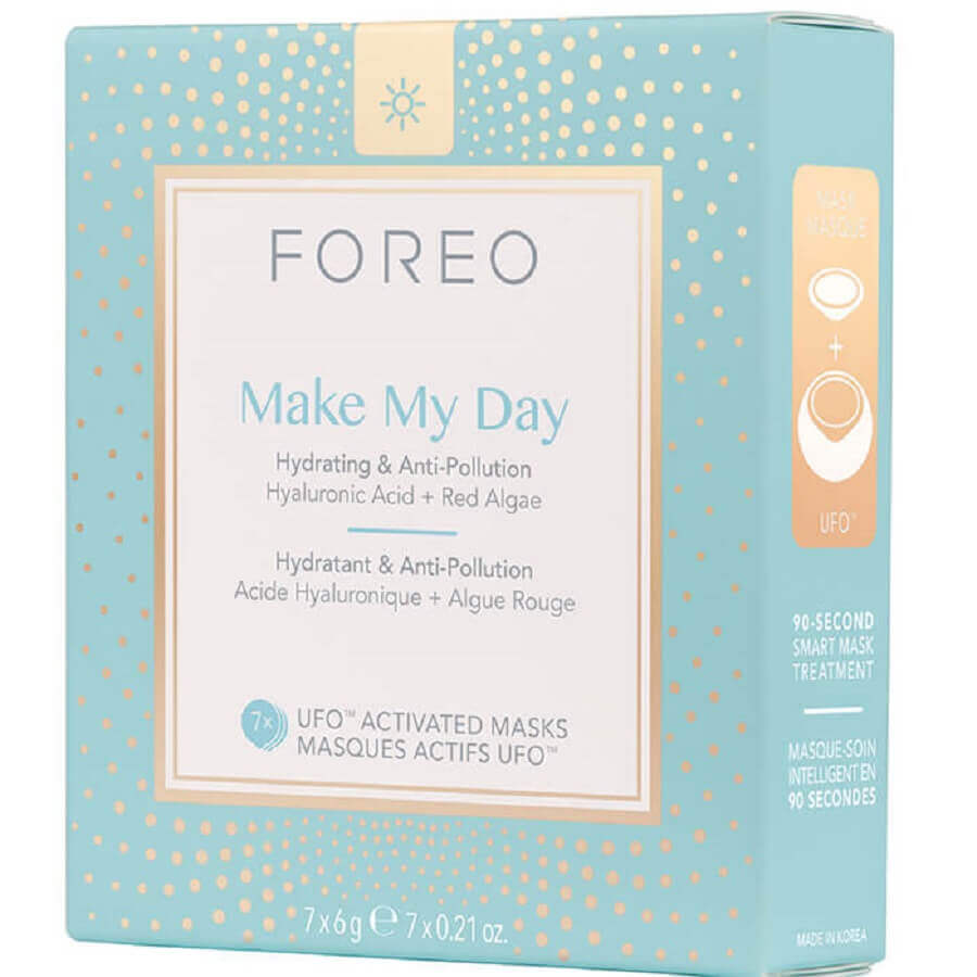 Spremenite 20-minutni tretma čiščenja obraza v 90 sekund čistega užitka! Vsaka vrhunska formula maske je združena s posebnim tretmajem z napravo UFO, ki je zasnovana tako, da koža žari od jutra do večera. Maska Make My Day, ki jo aktivira naprava UFO, vsebuje hialuronsko kislino in rdeče alge, ki zagotavljajo globoko vlaženje in zaščito pred nečistočami za sijočo polt.