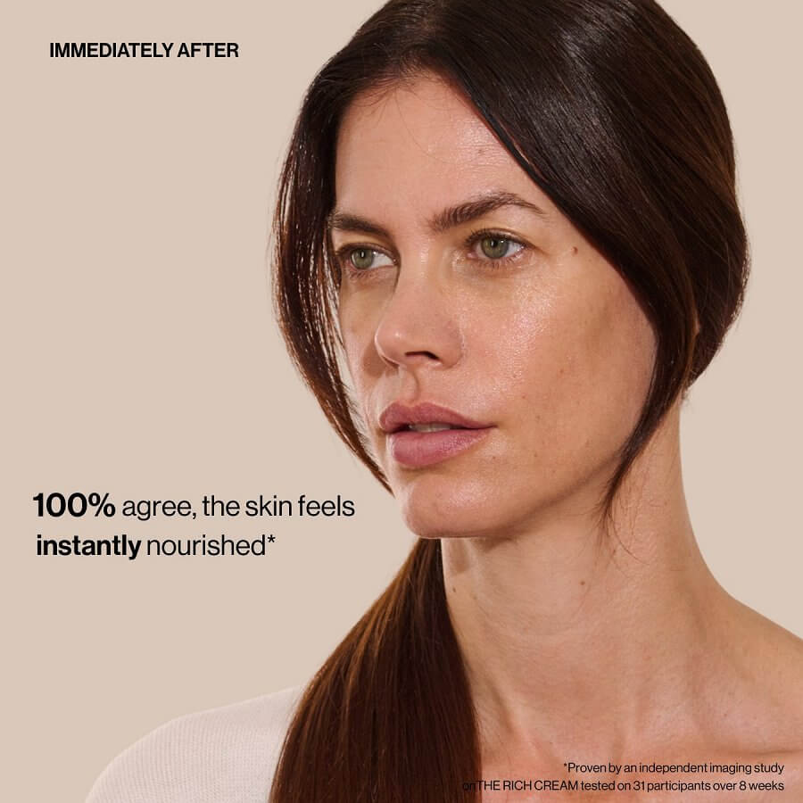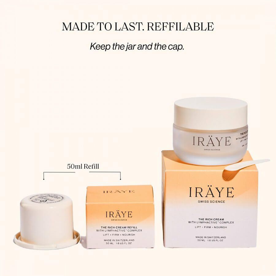 IRÄYE The Rich Cream, razvita na podlagi več kot 20 let raziskav, je posebej formulirana za suho, občutljivo in zrelo kožo ter vsebuje izjemno visoko koncentracijo inovativnega kompleksa Lymphactive™. Ta krema za obraz podpira naravne procese kože in zagotavlja globinsko vlaženje. Obogatena z ektoinom in hialuronsko kislino, formula zmanjšuje videz drobnih linij in lahko izboljša čvrstost kože že v štirih tednih. Trojica sestavin – niacinamid, skvalan in karitejevo maslo – zagotavlja intenzivno nego, medtem ko Pentavitin krepi kožno pregrado. Popoln zaveznik za vitalen in uravnotežen ten!