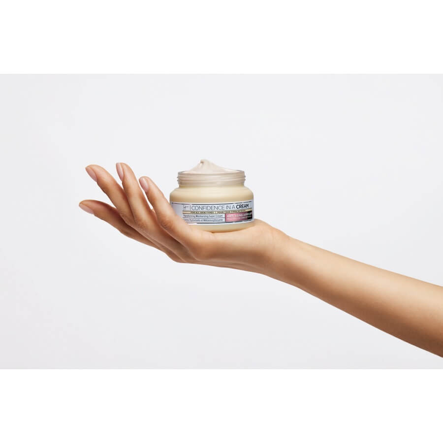Confidence in a Cream je dermatološko priporočena krema proti staranju, ki obnavlja kožno bariero in blaži vidne znake staranja. Nova formula vsebuje dvakrat več aktivnih sestavin in vlažilnih snovi za vidno zmanjšanje gub ter čvrstejšo in bolj polno kožo.