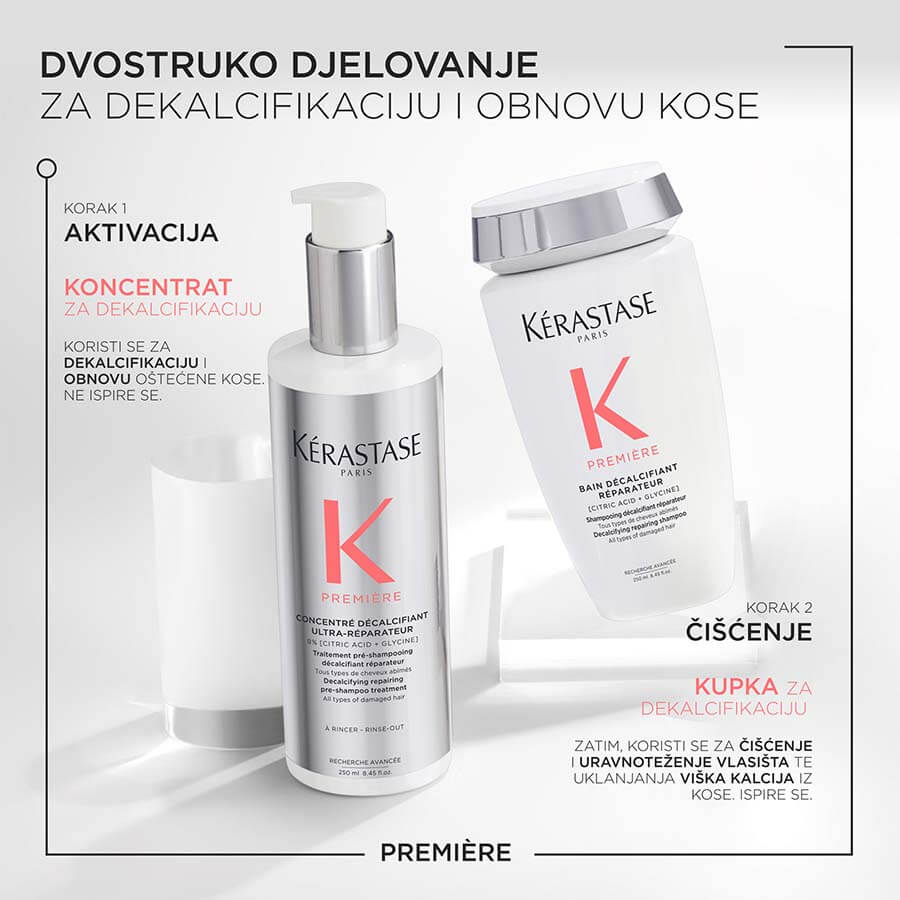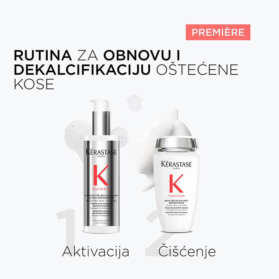 Za najboljše rezultate priporočamo, da Kérastase Première Bain Décalcifiant Réparateur šampon nanesete po Kérastase Concentré Décalcifiant Ultra-Réparateur predtretmanu brez predhodnega izpiranja. Uporabljajte ga z drugimi izdelki iz serije Première, kot je Masque Filler Réparateur za ekstra obnovitvene rezultate.