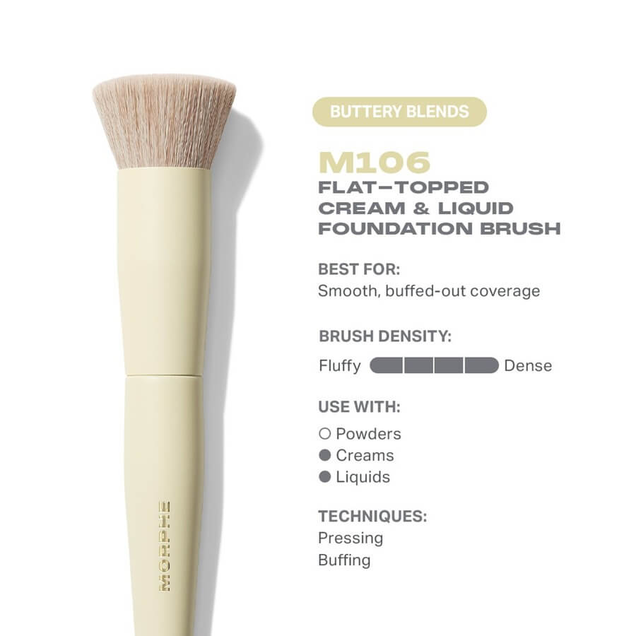 Kultni čopič za tekoči puder v omejeni izdaji, v masleno rumenem odtenku, tako zaželenem, da se boš ob vsaki uporabi preprosto stopila. Pahljačasti čopič Buttery Blends z ravno prirezanim vrhom za kremne in tekoče pudre ima gosto razporejena vlakna, ki omogočajo visoko koncentriran nanos izdelka. Ravno površino uporabi za zajemanje izdelka, nato ga vtisni v kožo in zabriši s krožnimi gibi.