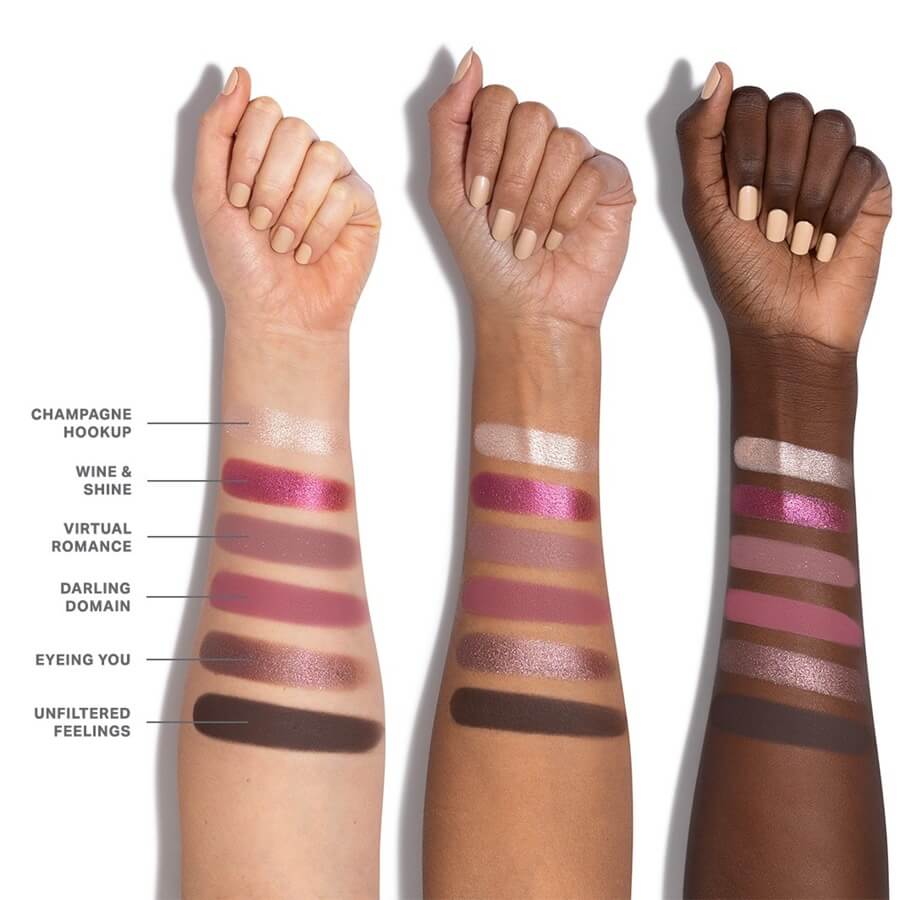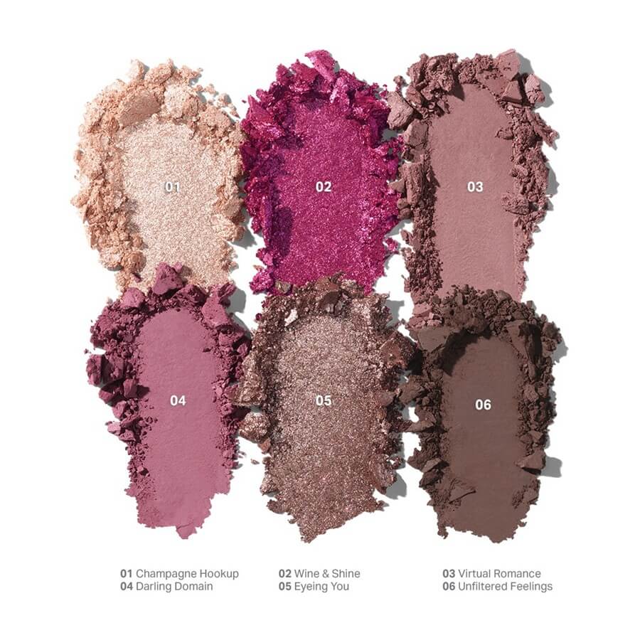 DARLING DOMAINTalc, Mica, Silica, Synthetic Fluorphlogopite, Magnesium Stearate, Dimethicone, Hydrogenated Polyisobutene, Octyldodecyl Stearoyl Stearate, Boron Nitride, Phenoxyethanol, Bis-Diglyceryl Polyacyladipate-2, Maltodextrin, Tocopheryl Acetate, Lauroyl Lysine, Magnesium Myristate, Hydroxyapatite, Mangifera Indica (Mango) Seed Oil, Caprylyl Glycol, Ethylhexylglycerin, Zinc Oxide, Tocopherol, +/- May Contain/Peut Contenir: Iron Oxides (CI 77491, CI 77499), Blue 1 Lake (CI 42090), Carmine (CI 75470).UNFILTERED FEELINGSTalc, Mica, Silica, Synthetic Fluorphlogopite, Magnesium Stearate, Dimethicone, Hydrogenated Polyisobutene, Octyldodecyl Stearoyl Stearate, Boron Nitride, Phenoxyethanol, Bis-Diglyceryl Polyacyladipate-2, Tocopheryl Acetate, Lauroyl Lysine, Magnesium Myristate, Hydroxyapatite, Mangifera Indica (Mango) Seed Oil, Caprylyl Glycol, Ethylhexylglycerin, Zinc Oxide, Triethoxycaprylylsilane, Tocopherol, +/- May Contain/Peut Contenir: Titanium Dioxide (CI 77891), Iron Oxides (CI 77491, CI 77492, CI 77499).VIRTUAL ROMANCETalc, Mica, Synthetic Fluorphlogopite, Silica, Magnesium Stearate, Calcium Aluminum Borosilicate, Dimethicone, Hydrogenated Polyisobutene, Octyldodecyl Stearoyl Stearate, Boron Nitride, Phenoxyethanol, Bis-Diglyceryl Polyacyladipate-2, Magnesium Myristate, Tocopheryl Acetate, Lauroyl Lysine, Hydroxyapatite, Mangifera Indica (Mango) Seed Oil, Caprylyl Glycol, Maltodextrin, Ethylhexylglycerin, Zinc Oxide, Tin Oxide, Tocopherol, +/- May Contain/Peut Contenir: Titanium Dioxide (CI 77891), Iron Oxides (CI 77491, CI 77492, CI 77499), Blue 1 Lake (CI 42090), Carmine (CI 75470). CHAMPAGNE HOOKUPMica, Synthetic Fluorphlogopite, Talc, Dimethicone, Hydrogenated Polyisobutene, Magnesium Stearate, Octyldodecyl Stearoyl Stearate, Ethylhexyl Palmitate, Bis-Diglyceryl Polyacyladipate-2, Silica, Boron Nitride, Phenoxyethanol, Vinyl Dimethicone/Methicone Silsesquioxane Crosspolymer, Aluminum Starch Octenylsuccinate, Tocopheryl Acetate, Lauroyl Lysine, Hydroxyapatite, Mangifera Indica (Mango) Seed Oil, Caprylyl Glycol, Water (Aqua, Eau), Tin Oxide, Ethylhexylglycerin, Zinc Oxide, Tocopherol, +/- May Contain/Peut Contenir: Titanium Dioxide (CI 77891), Iron Oxides (CI 77491, CI 77492, CI 77499). EYEING YOU, WINE & SHINESynthetic Fluorphlogopite, Dimethicone, Mica, Phenyl Trimethicone, Polyglyceryl-2 Triisostearate, Silica, Lauryl PEG-9 Polydimethylsiloxyethyl Dimethicone, Calcium Aluminum Borosilicate, Polysorbate 80, Calcium Sodium Borosilicate, Phenoxyethanol, Dimethicone/Vinyl Dimethicone Crosspolymer, Tin Oxide, Xanthan Gum, Lauroyl Lysine, Hydroxyapatite, Tocopheryl Acetate, Mangifera Indica (Mango) Seed Oil, Ethylhexylglycerin, Kaolin, Sodium Acrylate/Sodium Acryloyldimethyl Taurate Copolymer, Zinc Oxide, Water (Aqua, Eau), Isohexadecane, Caprylyl Glycol, Sorbitan Oleate, Tocopherol, +/- May Contain/Peut Contenir: Titanium Dioxide (CI 77891), Iron Oxides (CI 77491, CI 77499).