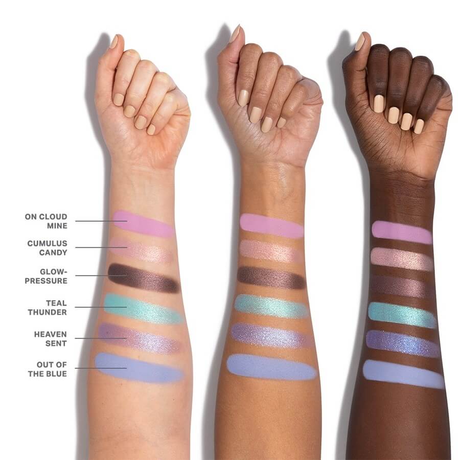 ON CLOUD MINETalc, Mica, Silica, Synthetic Fluorphlogopite, Magnesium Stearate, Dimethicone, Hydrogenated Polyisobutene, Octyldodecyl Stearoyl Stearate, Boron Nitride, Phenoxyethanol, Bis-Diglyceryl Polyacyladipate-2, Triethoxycaprylylsilane, Tocopheryl Acetate, Maltodextrin, Lauroyl Lysine, Magnesium Myristate, Hydroxyapatite, Mangifera Indica (Mango) Seed Oil, Caprylyl Glycol, Ethylhexylglycerin, Zinc Oxide, Tocopherol, +/- May Contain/Peut Contenir: Titanium Dioxide (CI 77891), Blue 1 Lake (CI 42090), Carmine (CI 75470).OUT OF THE BLUETalc, Mica, Silica, Synthetic Fluorphlogopite, Magnesium Stearate, Dimethicone, Hydrogenated Polyisobutene, Octyldodecyl Stearoyl Stearate, Boron Nitride, Phenoxyethanol, Bis-Diglyceryl Polyacyladipate-2, Tocopheryl Acetate, Lauroyl Lysine, Magnesium Myristate, Hydroxyapatite, Triethoxycaprylylsilane, Mangifera Indica (Mango) Seed Oil, Caprylyl Glycol, Ethylhexylglycerin, Zinc Oxide, Tocopherol, +/- May Contain/Peut Contenir: Titanium Dioxide (CI 77891), Iron Oxides (CI 77492, CI 77499), Manganese Violet (CI 77742), Ultramarines (CI 77007).GLOW-PRESSUREMica, Talc, Synthetic Fluorphlogopite, Dimethicone, Hydrogenated Polyisobutene, Magnesium Stearate, Octyldodecyl Stearoyl Stearate, Bis-Diglyceryl Polyacyladipate-2, Silica, Phenoxyethanol, Tocopheryl Acetate, Lauroyl Lysine, Hydroxyapatite, Ethylhexyl Palmitate, Vinyl Dimethicone/Methicone Silsesquioxane Crosspolymer, Boron Nitride, Mangifera Indica (Mango) Seed Oil, Caprylyl Glycol, Aluminum Starch Octenylsuccinate, Tin Oxide, Ethylhexylglycerin, Zinc Oxide, Water (Aqua, Eau), Tocopherol, +/- May Contain/Peut Contenir: Titanium Dioxide (CI 77891), Iron Oxides (CI 77491, CI 77499). TEAL THUNDERCalcium Aluminum Borosilicate, Silica, Talc, Dimethicone, Hydrogenated Polyisobutene, Calcium Sodium Borosilicate, Magnesium Stearate, Synthetic Fluorphlogopite, Octyldodecyl Stearoyl Stearate, Ethylhexyl Palmitate, Bis-Diglyceryl Polyacyladipate-2, Boron Nitride, Phenoxyethanol, Vinyl Dimethicone/Methicone Silsesquioxane Crosspolymer, Tin Oxide, Aluminum Starch Octenylsuccinate, Tocopheryl Acetate, Lauroyl Lysine, Hydroxyapatite, Mangifera Indica (Mango) Seed Oil, Caprylyl Glycol, Water (Aqua, Eau), Triethoxycaprylylsilane, Ethylhexylglycerin, Zinc Oxide, Tocopherol, +/- May Contain/Peut Contenir: Titanium Dioxide (CI 77891), Yellow 5 Lake (CI 19140), Blue 1 Lake (CI 42090). CUMULUS CANDYMica, Synthetic Fluorphlogopite, Dimethicone, Phenyl Trimethicone, Octyldodecyl Stearoyl Stearate, Polyglyceryl-2 Triisostearate, Caprylic/Capric Triglyceride, Calcium Sodium Borosilicate, Lauryl PEG-9 Polydimethylsiloxyethyl Dimethicone, Dipentaerythrityl Hexahydroxystearate/Hexastearate/Hexarosinate, Isostearyl Neopentanoate, Polysorbate 80, Silica, HDI/Trimethylol Hexyllactone Crosspolymer, Vinyl Dimethicone/Methicone Silsesquioxane Crosspolymer, Phenoxyethanol, Dimethicone/Vinyl Dimethicone Crosspolymer, Tin Oxide, Lauroyl Lysine, Hydroxyapatite, Tocopheryl Acetate, Xanthan Gum, Mangifera Indica (Mango) Seed Oil, Ethylhexylglycerin, Caprylyl Glycol, Zinc Oxide, Sodium Acrylate/Sodium Acryloyldimethyl Taurate Copolymer, Water (Aqua, Eau), Isohexadecane, Maltodextrin, Sorbitan Oleate, Tocopherol, +/- May Contain/Peut Contenir: Titanium Dioxide (CI 77891), Blue 1 Lake (CI 42090), Carmine (CI 75470). HEAVEN SENTCalcium Aluminum Borosilicate, Dimethicone, Phenyl Trimethicone, Mica, Synthetic Fluorphlogopite, Polyglyceryl-2 Triisostearate, Silica, Lauryl PEG-9 Polydimethylsiloxyethyl Dimethicone, Polysorbate 80, Dimethicone/Vinyl Dimethicone Crosspolymer, Phenoxyethanol, Tin Oxide, Lauroyl Lysine, Hydroxyapatite, Xanthan Gum, Tocopheryl Acetate, Mangifera Indica (Mango) Seed Oil, Ethylhexylglycerin, Caprylyl Glycol, Sodium Acrylate/Sodium Acryloyldimethyl Taurate Copolymer, Zinc Oxide, Water (Aqua, Eau), Isohexadecane, Sorbitan Oleate, Tocopherol, +/- May Contain/Peut Contenir: Titanium Dioxide (CI 77891), Iron Oxides (CI 77491, CI 77499), Ferric Ferrocyanide (CI 77510), Manganese Violet (CI 77742).