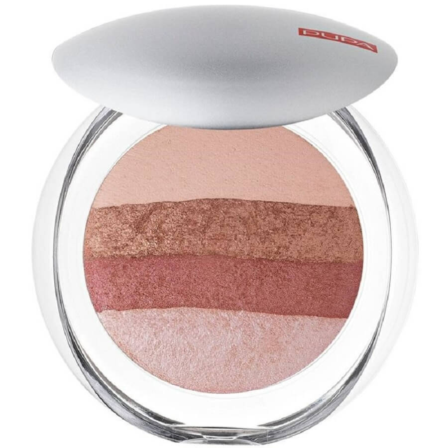 4 odtenki v enem proizvodu, ki se lahko uporabijo posamično ali v kombinaciji. Lahko se uporabi kot puder v kamnu (med seboj pomešane odtenke nanesete čez celoten obraz) ali kot rdečilo in osvetljevalec - intenzivnejši nanos na željene predele. Tekstura je lahkotna in svilnata. Vsebuje jojobino olje, ki kožo nahrani.