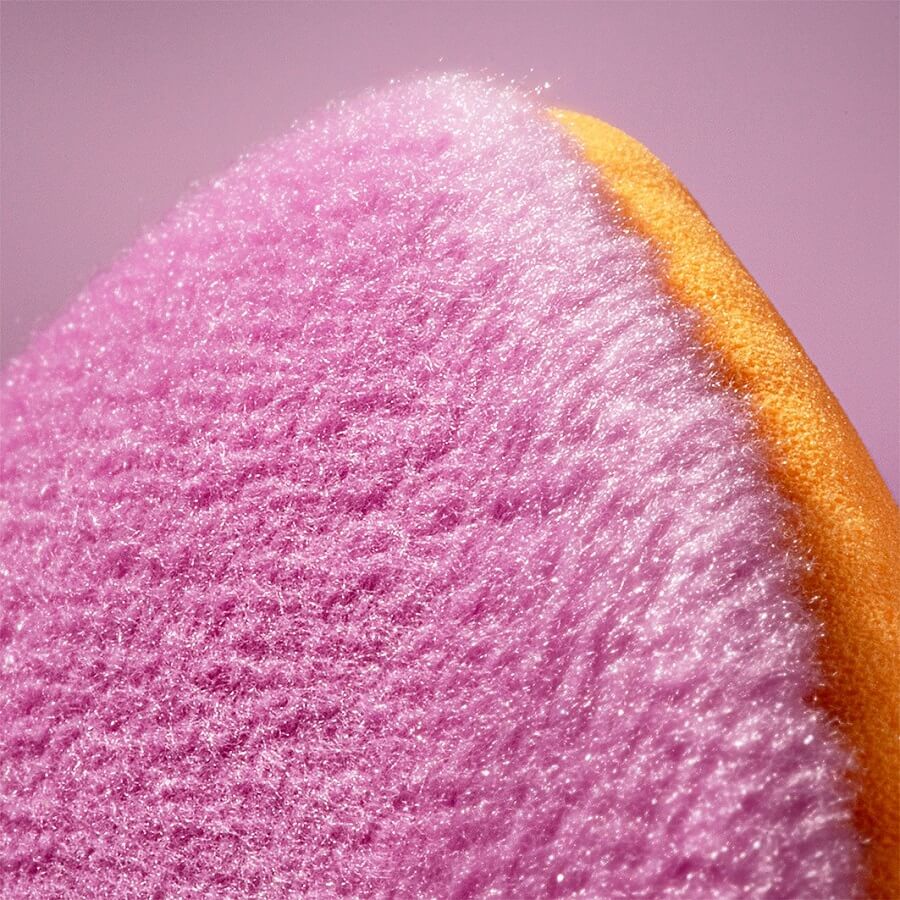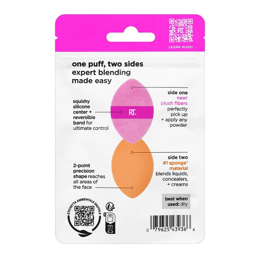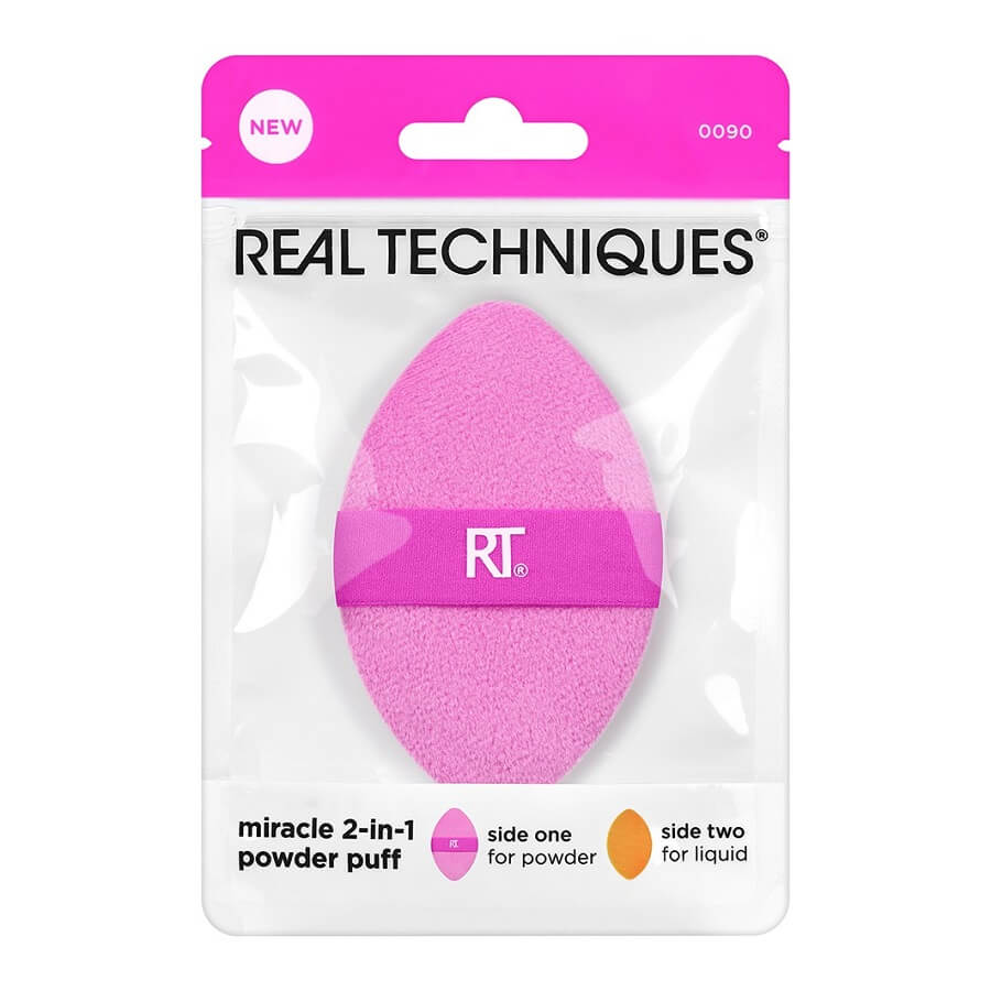 Real Techniques Miracle 2-in-1 Powder Puff je večnamenska spužvica z dvojno teksturo – zasnovana za delo s pudri v prahu ter tekočim ali kremnimi izdelki. Rožnata stran vsebuje NOVA plišasta vlakna, ki vpijejo in nanesejo ravno pravšnjo količino katerega koli pudrastega izdelka za utrjevanje podlage ali osvežitev ličil. Oranžna stran je izdelana iz materiala #1 Miracle Complexion Sponge za enostavno mešanje tekočih ali kremnih formul. Obe strani spužvice je najbolje uporabiti suhi. Patentirana 2-točkovna natančna oblika Real Techniques je strokovno oblikovana tako, da doseže vsa področja obraza – pod očmi in okoli nosu. Reverzibilni elastični trak omogoča nemoteno uporabo obeh strani in vam omogoča največji nadzor.