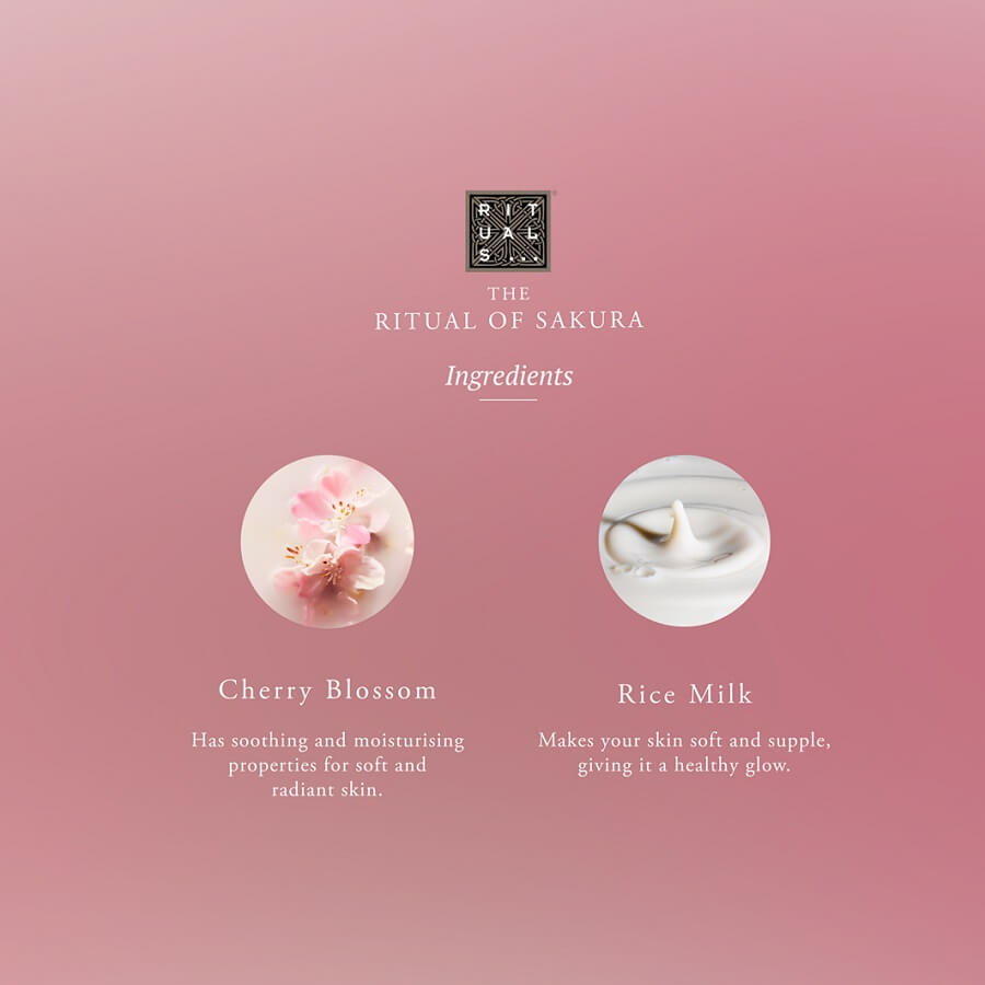 Najbolje prodajana krema za telo iz kolekcije The Ritual of Sakura je vse, kar potrebujete za razcvet. To žametno bogato kremo je preprosto nanesti, kožo pa intenzivno nahrani in učvrsti. Njena formula hkrati vsebuje antioksidante, vitamin E in gotu kolo (Centella asiatica), ki zagotavljajo izjemno mehko kožo, odlikuje pa jo prenovitveni vonj češnjevih cvetov in riževega mleka. Dišava se predstavi z nežnimi, mlečnimi spodnjimi toni, ki jih spremljajo živahne zelene note, in se končno razvije v harmonično mešanico sladke češnjeve arome in očarljivih cvetnih not. Izdelana iz 92 % sestavin naravnega izvora.